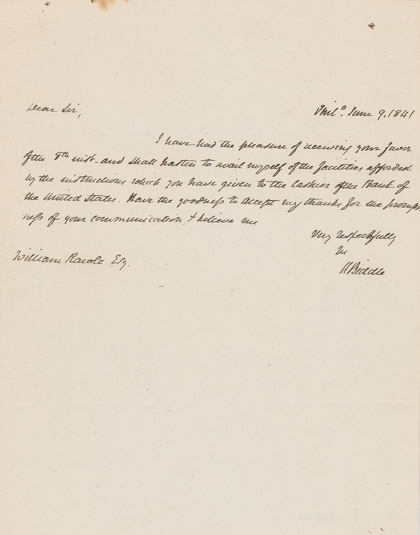 ALS signed “N. Biddle,” one page, 7.75 x 10, June 9, 1841. Letter to William Raiole, in part: "I have had the pleasure of receiving your favor of the 9th inst. and shall hasten to avail myself of the facilities afforded by the instructions which you have given to the cashier of the Bank of the United States. Have the goodness to accept my thanks for the promptness of your communication." In fine condition, with some small stains to the top.