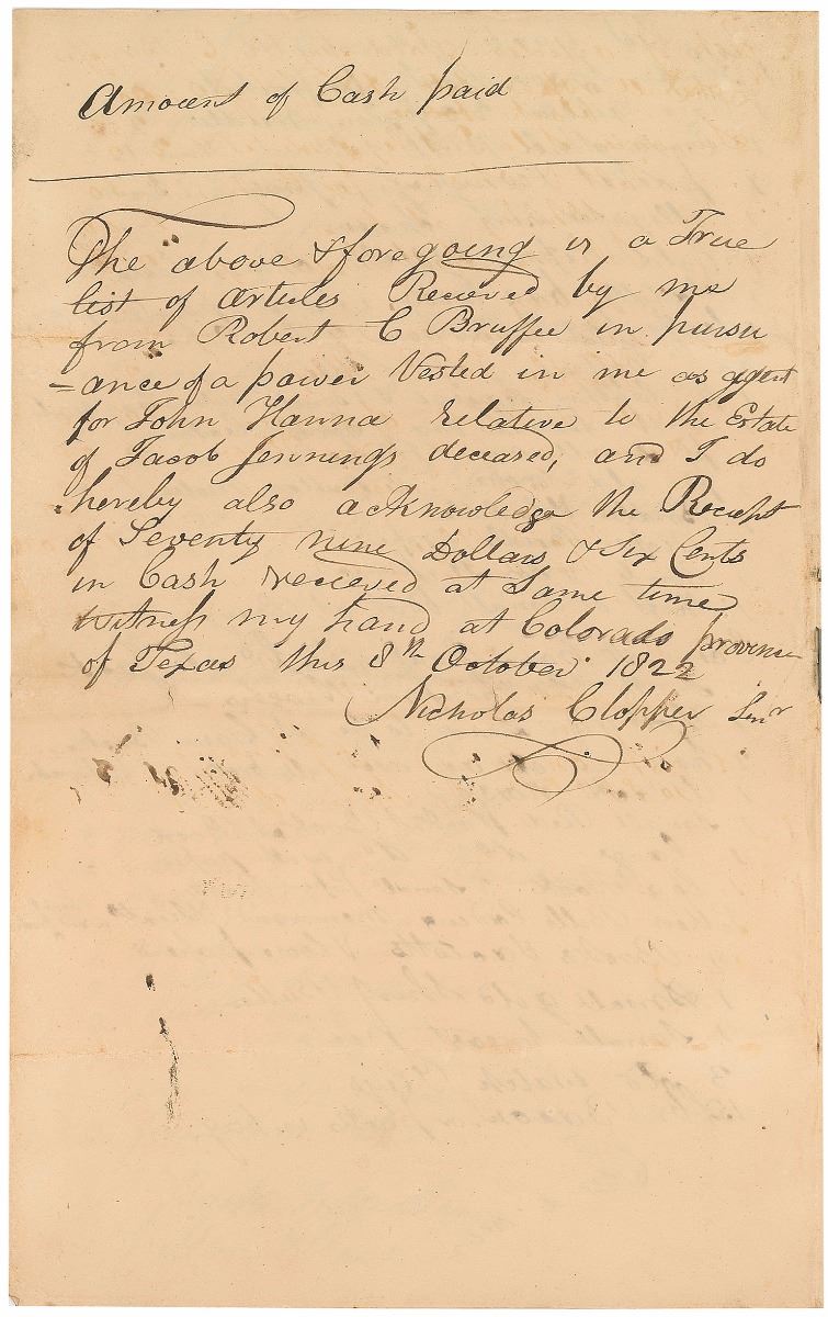 Early settler responsible for the acquisition of the famous ‘Twin Sisters’ cannons (1766–1841). ADS, eight pages on two sets of adjoining sheets, 7.75 x 12.5, October 8, 1822. Lengthy inventory of items in an estate penned mostly in Clopper’s hand and certified at the conclusion, in part: “The above & foregoing is a True list of articles Received by me from Robert C. Bruffee…relative to the Estate of Jacob Jennings deceased.” Items on the list include “1 bag leaf Tobacco,” “2 handsaws,” “1 Cow hide & Bear skin,” “1 black bottle whisky,” “1 pocket Compass,” “1 Bridle & Saddle,” and “1 Black horse.” Includes three additional documents in other hands also concerning the estate. In fine condition, with expected document wear. Provenance: The Robert Davis Collection.