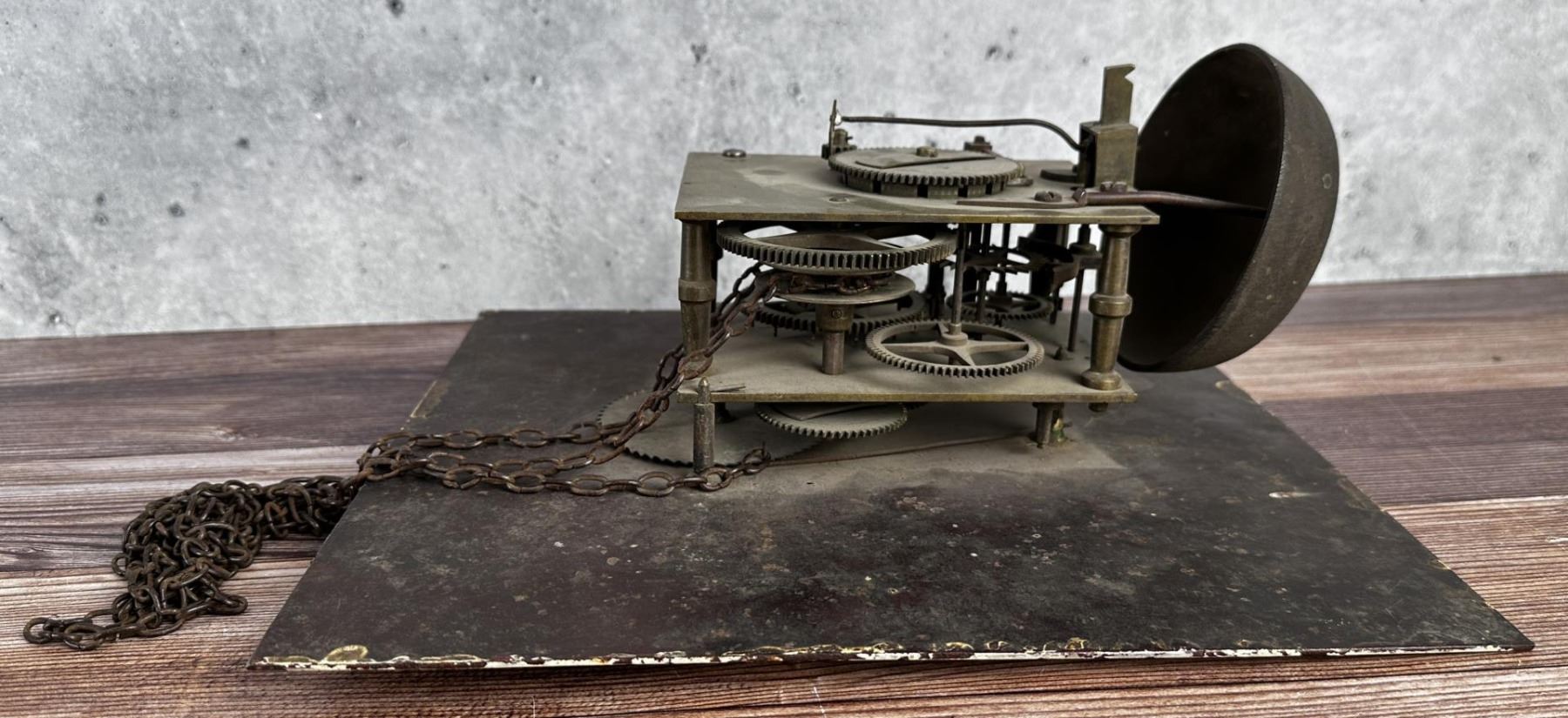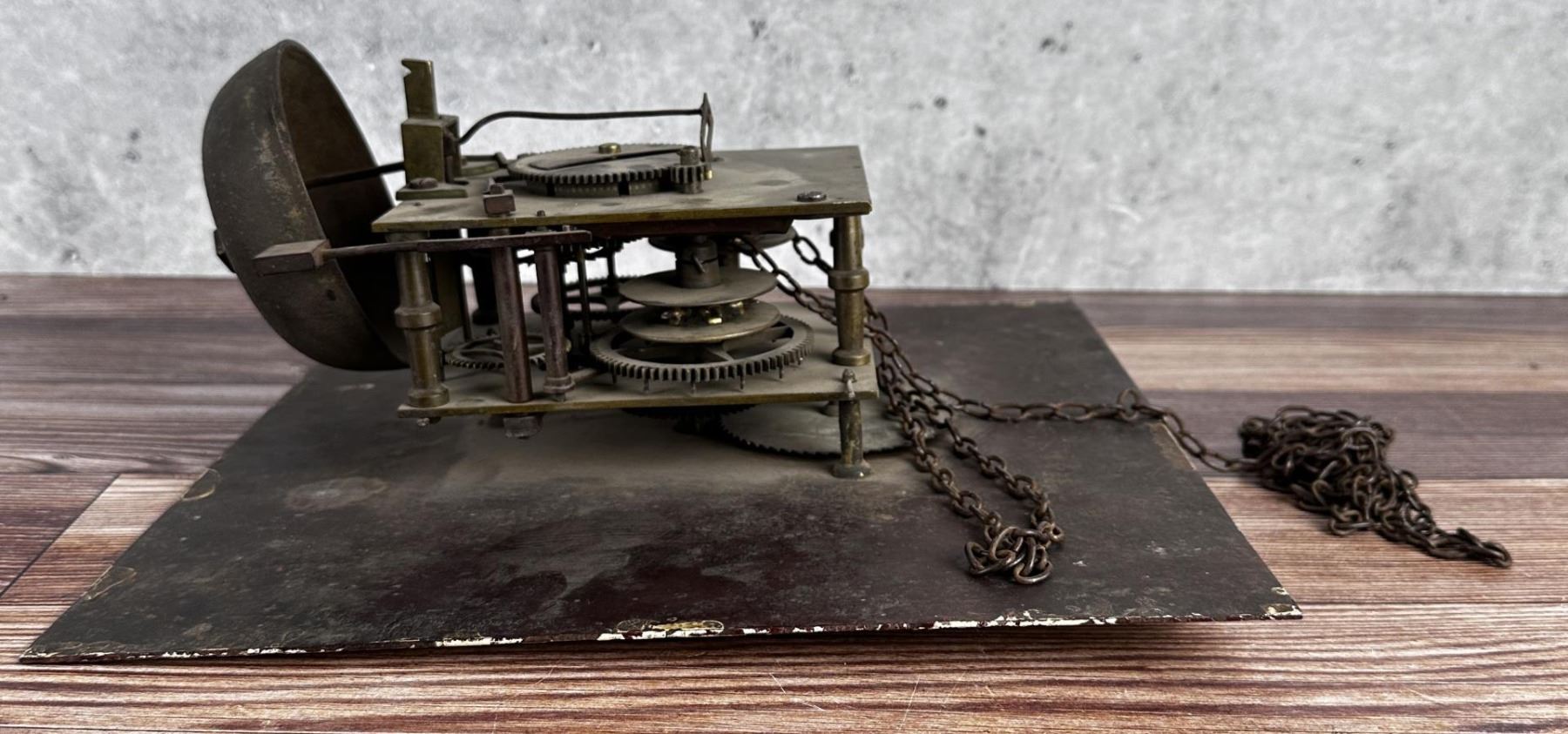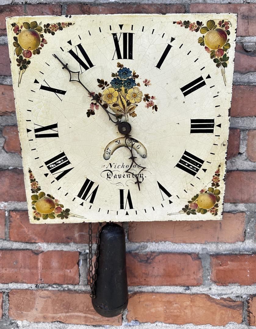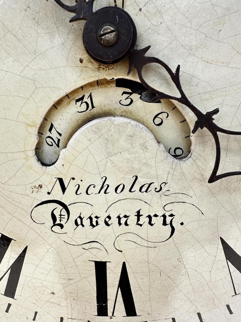 Movement is 12" by 12" by 5 1/4". Dial is signed Nicholas Daventry. Nicholas the Clockmaker of Sheaf Street, Daventry was in business from 1840 - 1877.