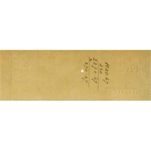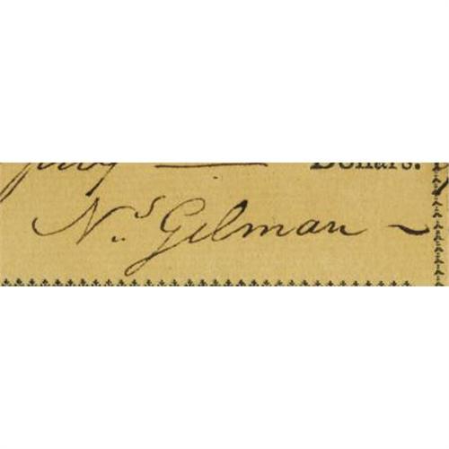 <B>Nicholas Gilman Partly Printed Check Signed</B></I> "<I>Ns. Gilman</B></I>" and "<I>N.G.,</B></I>"one page, 6.25" x 2". Bank of the United States, April 22, 1800. Filled out by the signer of the Constitution, payable to himself ("<I>N.G."</B></I>) for $1840.67. Ciphering on verso relating to the check. Hole cancellation in the center of the check. Gilman represented New Hampshire in the Continental Congress (1787-1789), the House of Representatives (1789-1797) and the U.S. Senate (1805-1814). In 1802, when he was defeated for the U.S. Senate as a Democratic-Republican, President Jefferson appointed him as a bankruptcy commissioner. The charter of the First Bank of the United States, located in Philadelphia, was signed by President Washington in 1791. Uniformly tanned, in very fine condition.<BR><BR><b>Shipping:</b> Flat Material, Small (<a target="_blank" href="http://www.heritageauctions.com/common/shipping.php">view shipping information</a>)