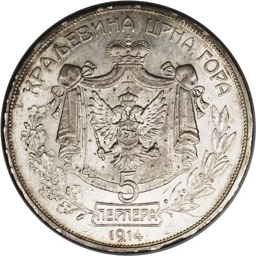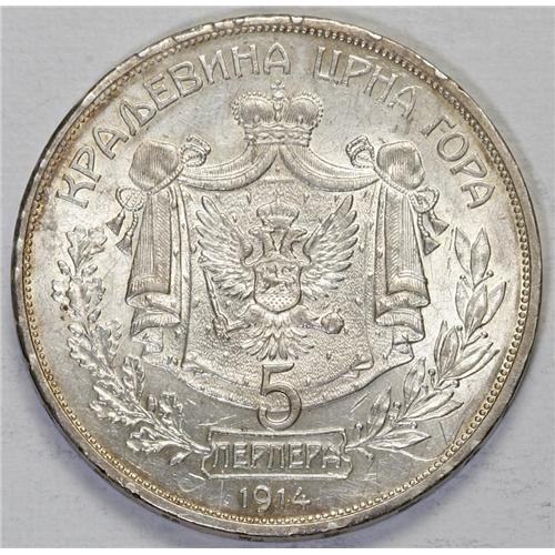 Nicholas I 5 Perpera 1914, KM15, XF/AU, lightly toned,