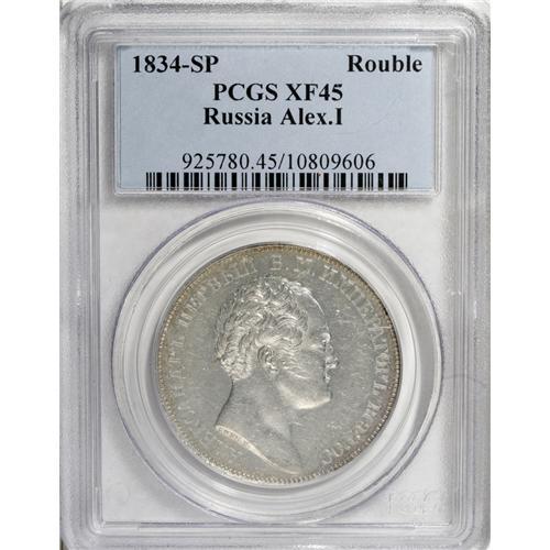<B>Nicholas I. Alexander I Commemorative Rouble 1834,</B></I> by H. Gube, Bit-894, Uzd-4190, XF45 PCGS. Well struck and bright.<BR><BR><b>Shipping:</b> Coin/Currency (<a target="_blank" href="http://www.heritageauctions.com/common/shipping.php">view shipping information</a>)