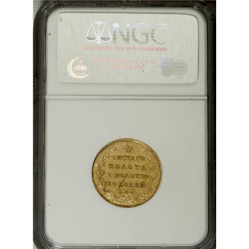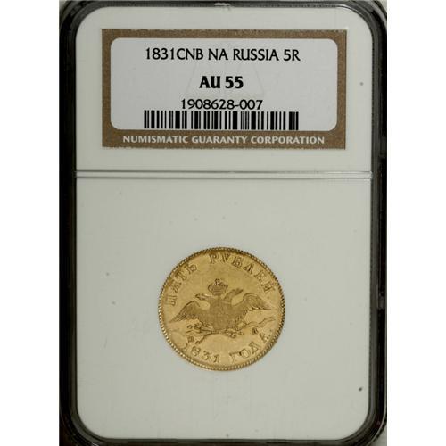 <B>Nicholas I. Gold 5 Roubles 1831 C??-??, wings down</B></I> Bit-6, AU55 NGC. Moderately abraded with a decent strike and some remaining luster. The last year of this elusive type.<BR><BR><b>Shipping:</b> Coin/Currency (<a target="_blank" href="http://www.heritageauctions.com/common/shipping.php">view shipping information</a>)