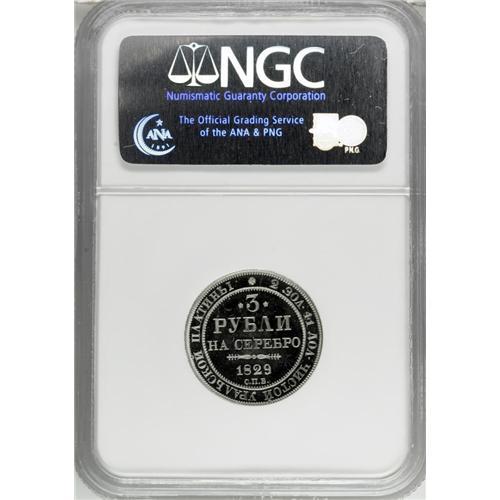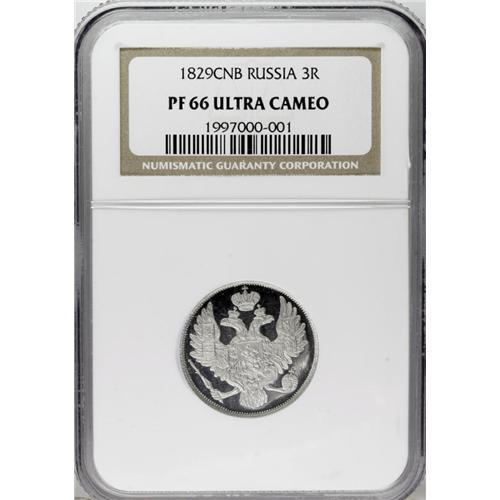 <B>Nicholas I. Platinum 3 Roubles 1829 C??,</B></I> F-160, Bit-74, Proof 66 Ultra Cameo NGC. A spectacular piece with fully frosted devices and pristine deeply mirrored fields. The 9 appears to be over and 8.<BR><BR><b>Shipping:</b> Coin/Currency (<a target="_blank" href="http://www.heritageauctions.com/common/shipping.php">view shipping information</a>)