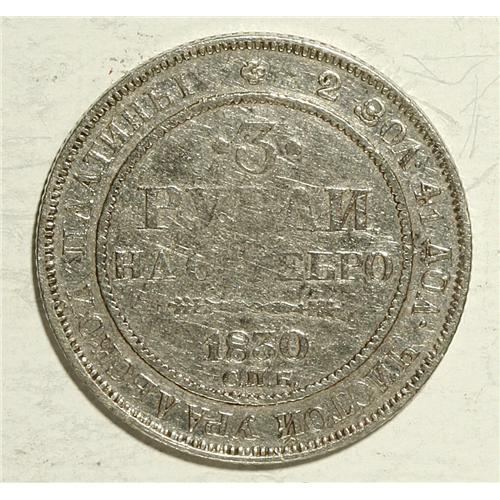 <B>Nicholas I. Platinum 3 Roubles 1830 C??,</B></I> F-160, Bit-75, Fine with obverse scrapes and softly struck reverse center.<BR><BR><b>Shipping:</b> Coin/Currency (<a target="_blank" href="http://www.heritageauctions.com/common/shipping.php">view shipping information</a>)