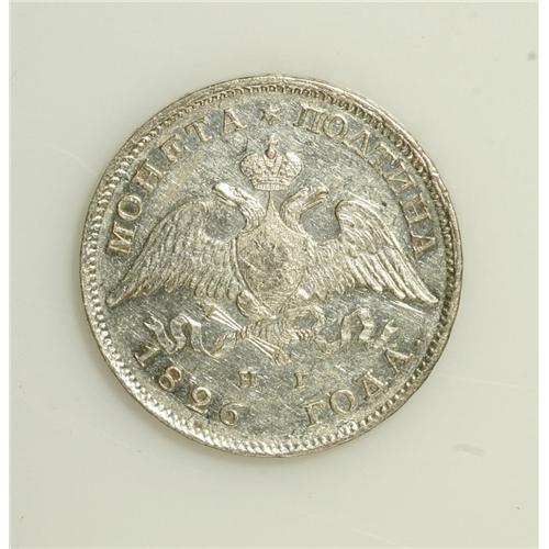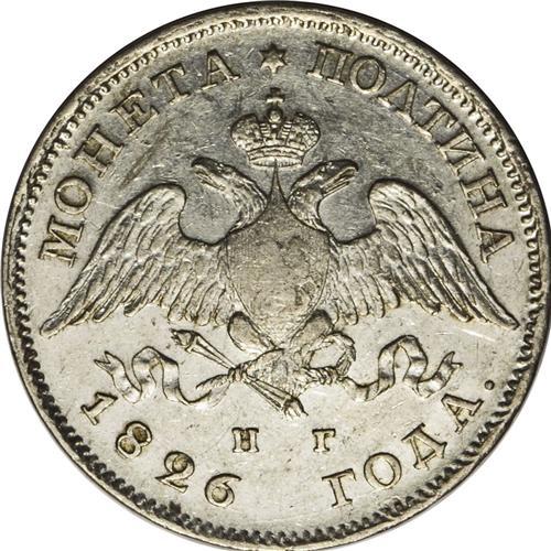<B>Nicholas I. Poltina (1/2 Rouble) 1826 C??-H?,</B></I> Bit-113, lustrous XF. Softly struck in the central part of the obverse with moderate abrasions.<BR><BR><b>Shipping:</b> Coin/Currency (<a target="_blank" href="http://www.heritageauctions.com/common/shipping.php">view shipping information</a>)