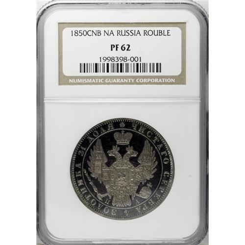 <B>Nicholas I. Proof Rouble 1850 C??-?A,</B></I> Bit-226, Proof 62 NGC. Lead-gray toning with hairlines on both sides and light scratches above the ?? of P??A? on the reverse.<BR><BR><b>Shipping:</b> Coin/Currency (<a target="_blank" href="http://www.heritageauctions.com/common/shipping.php">view shipping information</a>)