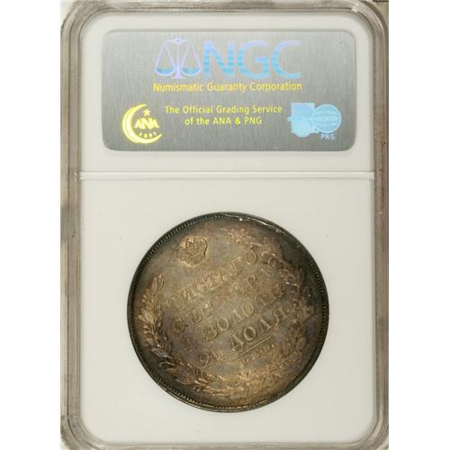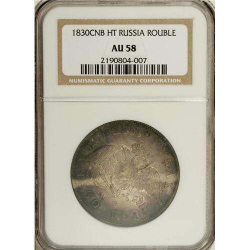 <B>Nicholas I. Rouble 1830 C??-H?,</B></I> Bit-108, AU58 NGC. Some luster with softness in the center of the obverse and flan flaws on the obverse.<BR><BR><b>Shipping:</b> Coin/Currency (<a target="_blank" href="http://www.heritageauctions.com/common/shipping.php">view shipping information</a>)