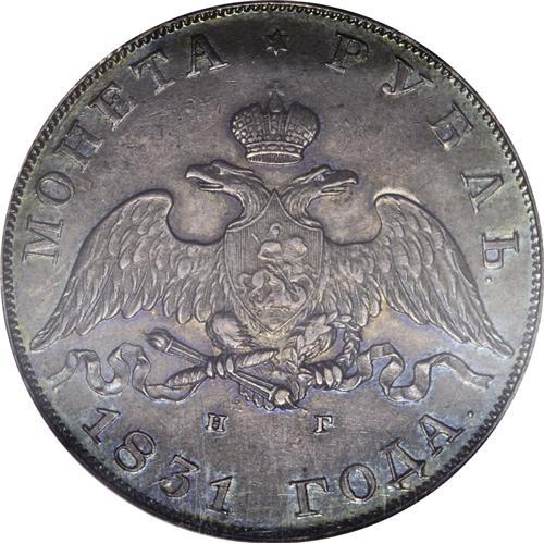 <B>Nicholas I. Rouble 1831 C??-H?,</B></I> Bit-111, MS64 NGC. Deep grayish-blue toning with some weakness on the highpoints and underlying luster.<BR><BR><b>Shipping:</b> Coin/Currency (<a target="_blank" href="http://www.heritageauctions.com/common/shipping.php">view shipping information</a>)
