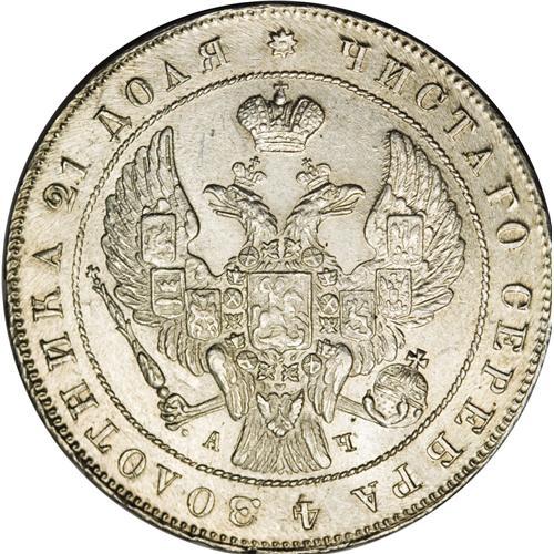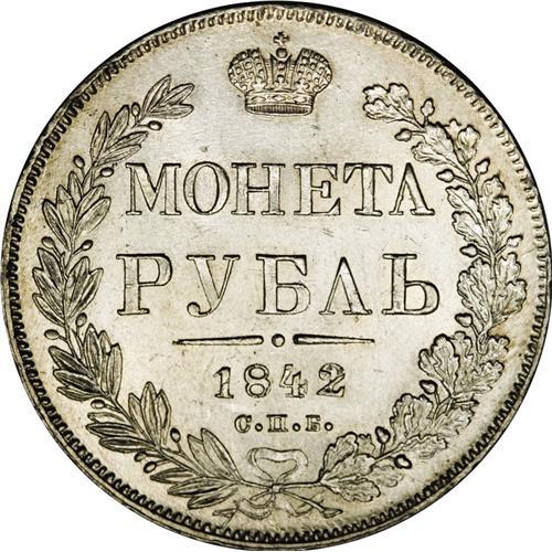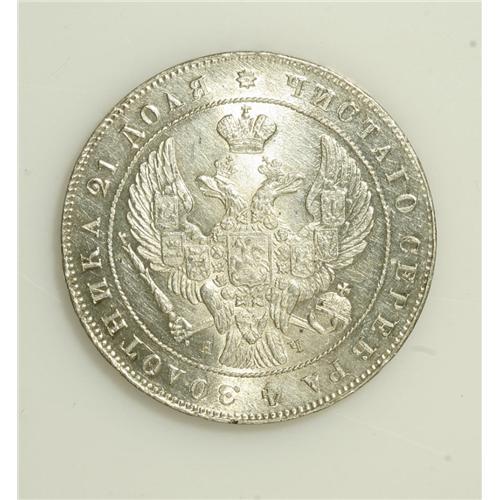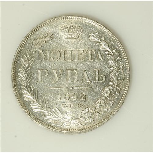 <B>Nicholas I. Rouble 1842/1 C??-A?,</B></I> Bit-185, AU-UNC with full glistening luster. An interesting piece with a very sharp 2/1 overdate. Fully brilliant mint frost, but hairlines, mainly on the reverse, keep us from calling this attractive piece UNC.<BR><BR><b>Shipping:</b> Coin/Currency (<a target="_blank" href="http://www.heritageauctions.com/common/shipping.php">view shipping information</a>)