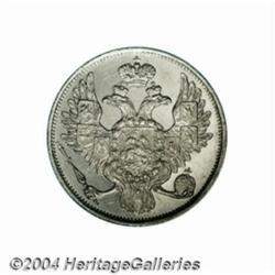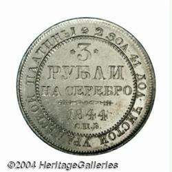 Nicholas I platinum 3 Roubles 1844, C-177, choice AU-UNC, prooflike luster and a nice cameo effect on the eagle, very desirable example. Important notice: Heritage usually auctions material at the rate of 200-250 lots per hour. On some occasions eBay Live bid software or the Internet may not be able to keep up with the pace of the auction. We recommend placing a realistic absentee bid now as insurance to avoid disappointment. Occasionally the auctioneer may eliminate or reject an eBay Live bid, and the auctioneer may also reopen a lot after the close of the eBay live bidding (usually because we missed an audience bid), and may reject your bid even if it shows you as the winning bidder. By bidding via eBay Live, you agree that Heritage may award the lot to another bidder at its sole discretion under the circumstances described above or any other reasonable circumstances. Also please note that all Heritage lots purchased through eBay Live carry a 20% Buyer's Premium. Please make sure you read the Terms and Conditions before you bid.