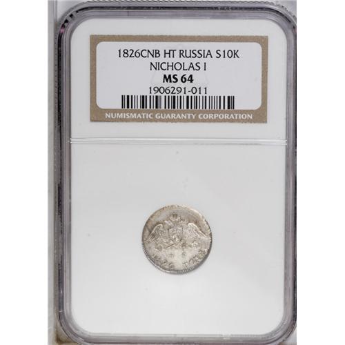 <B>Nicholas I silver 10 Kopecks 1826 C??-H?,</B></I> Bit-142, large crown, MS64 NGC. Lustrous and nicely toned with a nice strike. Very scarce in this condition.