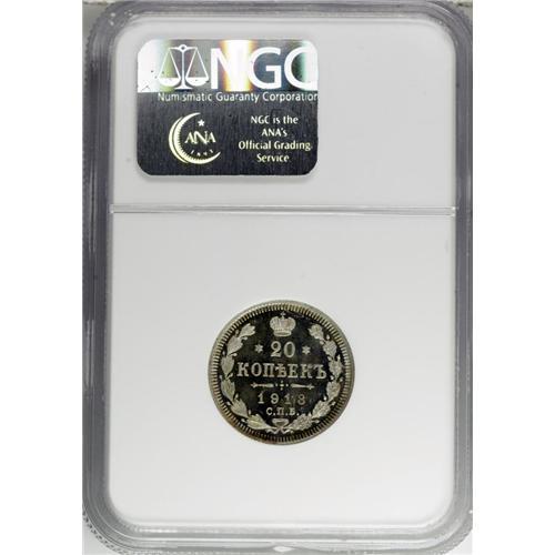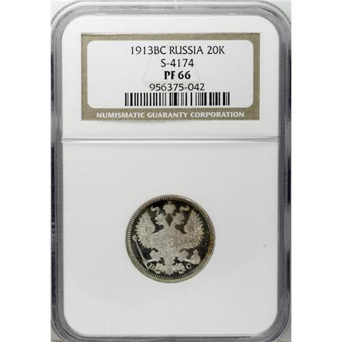 <B>Nicholas II. 20 Kopecks 1913 C??-BC,</B></I> Bit-115, Proof 66 NGC. Stunning cameo contrast with pristine surfaces.<BR><BR><b>Shipping:</b> Coin/Currency (<a target="_blank" href="http://www.heritageauctions.com/common/shipping.php">view shipping information</a>)