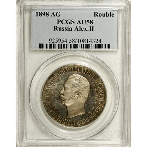 <B>Nicholas II. Alexander II Commemorative Rouble 1898,</B></I> Bit-323, Uzd-4198, AU58 PCGS. Mottled toning with prooflike surfaces and obvious hairlines on both sides.<BR><I>From the Monedas Oro Collection</B></I><BR><BR><b>Shipping:</b> Coin/Currency (<a target="_blank" href="http://www.heritageauctions.com/common/shipping.php">view shipping information</a>)