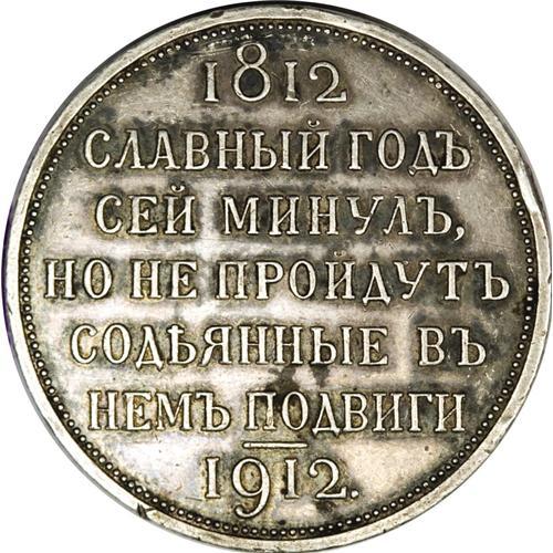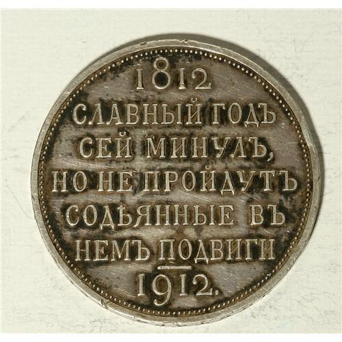 <B>Nicholas II. Centennial of the Napoleonic War Commemorative Rouble 1912,</B></I> Bit-334, Uzd-4200, XF details with light reverse scratches and noticeable rim bumps on both sides.<BR><BR><b>Shipping:</b> Coin/Currency (<a target="_blank" href="http://www.heritageauctions.com/common/shipping.php">view shipping information</a>)