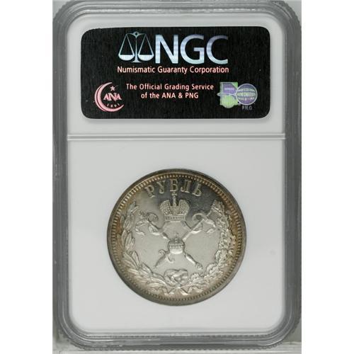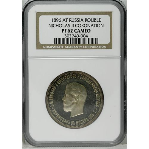 <B>Nicholas II. Coronation Rouble 1896,</B></I> Bit-322, Uzd-4197, golden toned, Cameo Proof 62 NGC with moderate hairlines on both sides.<BR><I>From the St. Petersburg Collection.</B></I>