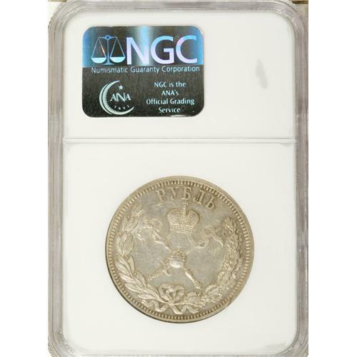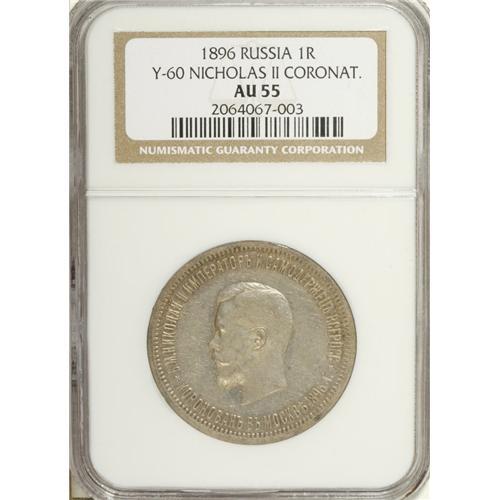 <B>Nicholas II. Coronation Rouble 1896,</B></I> Bit-322, Uzd-4197, AU55 NGC. Moderately abraded with prooflike surfaces and a touch of russet toning.<BR><BR><b>Shipping:</b> Coin/Currency (<a target="_blank" href="http://www.heritageauctions.com/common/shipping.php">view shipping information</a>)