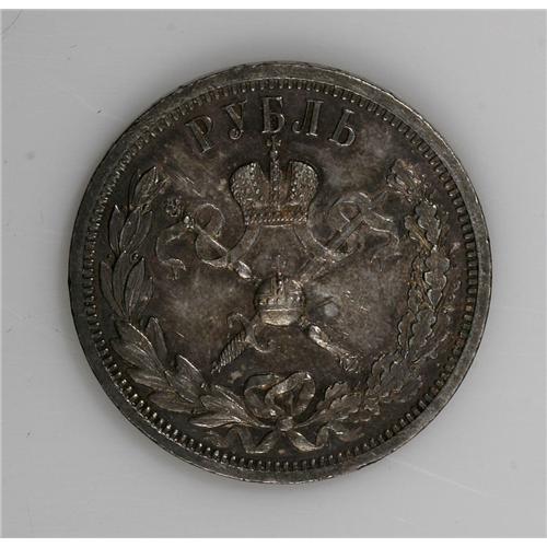 <B>Nicholas II. Coronation Rouble 1896,</B></I> Bit-322, Uzd-4197, prooflike AU with minor rim bumps. The reverse is toned in a deep gray-green color while the obverse is bright with a hint of sea-green patina around the periphery. There is a thin flan flaw in the upper obverse field.<BR><BR><b>Shipping:</b> Coin/Currency (<a target="_blank" href="http://www.heritageauctions.com/common/shipping.php">view shipping information</a>)