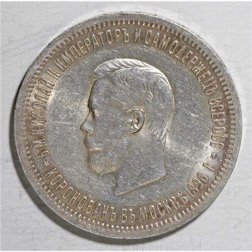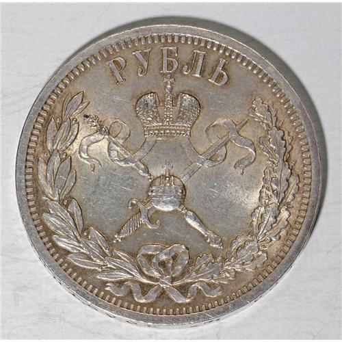 <B>Nicholas II. Coronation Rouble 1896,</B></I> Bit-322, Uzd-4197, Choice AU-UNC with frosted, rather than prooflike, surfaces. Full luster with a hint of golden toning. Moderate scuffing on both sides keeps us from calling this piece a full UNC.<BR><BR><b>Shipping:</b> Coin/Currency (<a target="_blank" href="http://www.heritageauctions.com/common/shipping.php">view shipping information</a>)