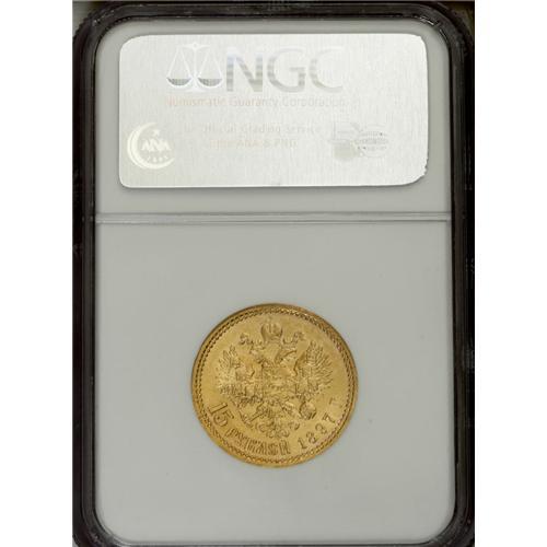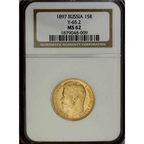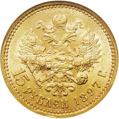 <B>Nicholas II. Gold 15 Roubles 1897 A?,</B></I> F-177, Bit-2, MS62 NGC. Full luster with light green-gold patina.<BR><BR><b>Shipping:</b> Coin/Currency (<a target="_blank" href="http://www.heritageauctions.com/common/shipping.php">view shipping information</a>)