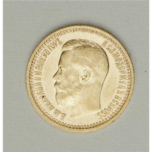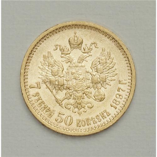 <B>Nicholas II. Gold 7-1/2 Roubles 1897 A?,</B></I> F-178, Bit-17, lustrous XF.<BR><BR><b>Shipping:</b> Coin/Currency (<a target="_blank" href="http://www.heritageauctions.com/common/shipping.php">view shipping information</a>)