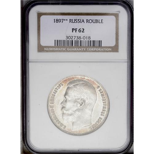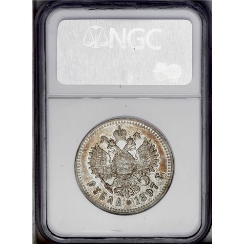 <B>Nicholas II. Rouble 1897 ** (Brussels),</B></I> Bit-203, Uzd-2078, Julian-1199, Proof 62 NGC. Frosted devices with scattered russet toning. A noticeable scratch on the obverse at 8 o'clock keeps this piece from a higher grade.<BR><I>From the St. Petersburg Collection.</B></I>