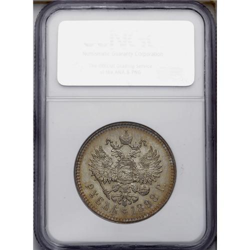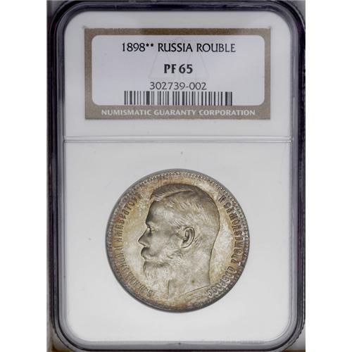 <B>Nicholas II Rouble 1898 ** (Brussels),</B></I> Bit-204, Uzd-2090, Julian-1203, Proof 65 NGC. Spectacular gold and steel-gray toning with a few tiny contact marks.<BR><I>From the St. Petersburg Collection.</B></I>