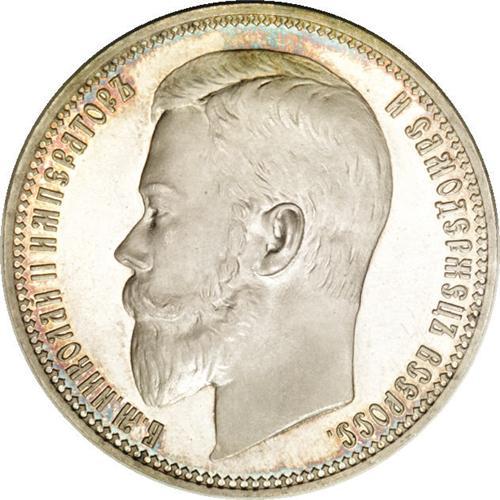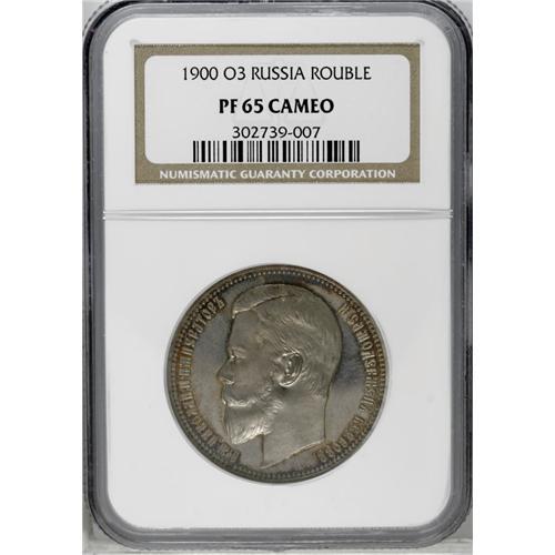 <B>Nicholas II. Rouble 1900-,</B></I> Bit-51, Uzd-2111, Julian-1207, Proof 65 Cameo NGC. Deeply mirrored fields with golden toning and bluish highlights.<BR><I>From the St. Petersburg Collection.</B></I>