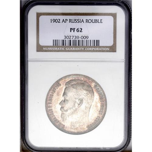 <B>Nicholas II. Rouble 1902-,</B></I> Bit-56, Uzd-2130, Julian-1210, Proof 62 NGC. Steel-blue and sea-green toning with noticeable hairlines and contact marks.<BR><I>From the St. Petersburg Collection.</B></I>