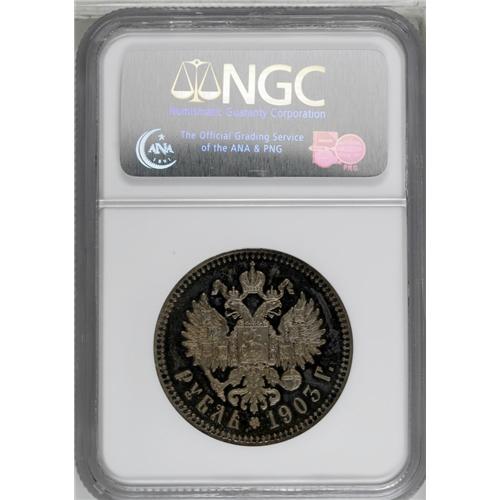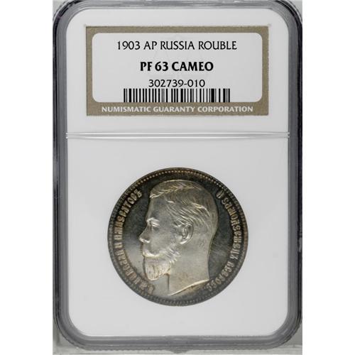 <B>Nicholas II. Rouble 1903-,</B></I> Bit-57, Uzd-2136, Julian-1211, Proof 63 Cameo NGC. Nicely frosted devices with gold, sea-green, and cobalt-blue toning. Light scratches are evident in the obverse fields.<BR><I>From the St. Petersburg Collection.</B></I>