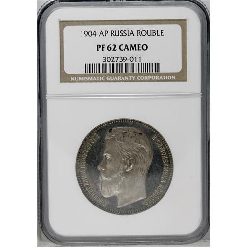 <B>Nicholas II. Rouble 1904-,</B></I> Bit-58, Uzd-2142, Julian-1212, Proof 62 Cameo NGC. Rose-gray toning with obverse hairlines and contact marks. A very scarce issue.<BR><I>From the St. Petersburg Collection.</B></I>