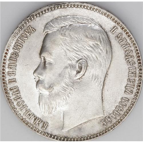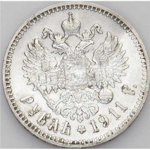 <B>Nicholas II. Rouble 1911-,</B></I> Bit-65, Uzd-2181, Julian-1219, cleaned AU with obverse rim bumps. Lustrous and white.<BR><I>From the St. Petersburg Collection.</B></I>