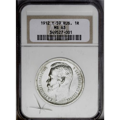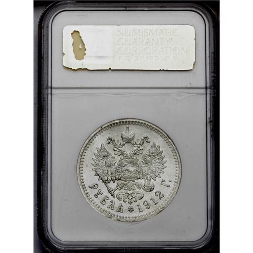 <B>Nicholas II. Rouble 1912-,</B></I> Bit-66, Uzd-2187, Julian-1220, MS63 NGC. Fully brilliant and white with light scuffing and heavy obverse die striations. The holder bears a spider crack on the front, bottom right side.