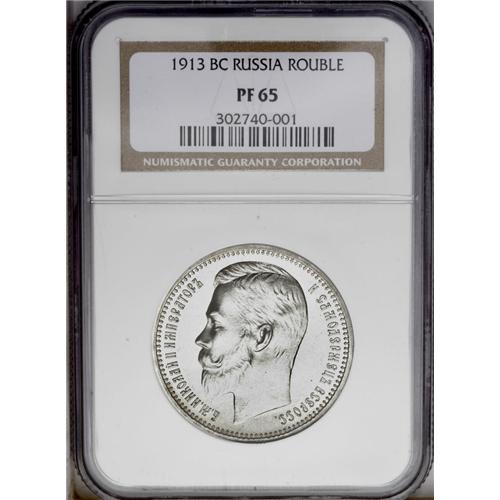 <B>Nicholas II. Rouble 1913-,</B></I> Bit-68, Uzd-2196, Julian-1222, Proof 65 NGC. Brilliant white and untoned with a few light hairlines.<BR><I>From the St. Petersburg Collection.</B></I>