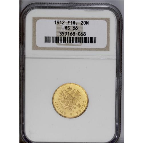 <B>Nicholas II gold 20 Markkaa 1912-S, </B></I>KM9.2, MS66 NGC.
