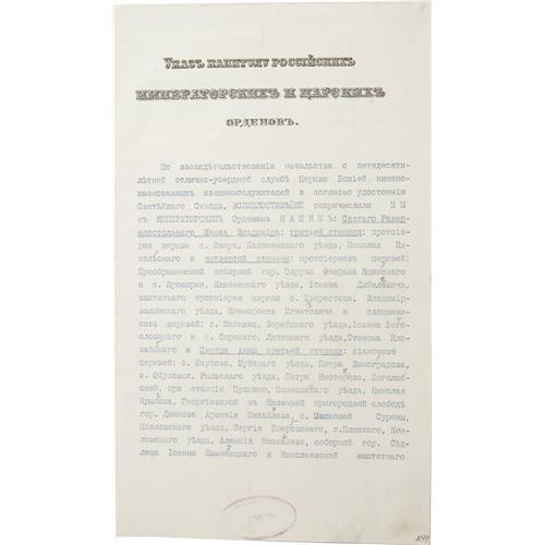 <B>Nicholas II of Russia Typed Document Signed.</B></I> "<I>Nikolai</B></I>", 2pp (front and verso), partially printed bestowal document, 8.25" x 14", October 16, 1914, Tsarskoe Selo. Edict to the Capitulum of Russian Imperial and Royal Orders granting the Order of Holy Prince Vladimir and the Order St. Anne to various priests and archpriests. Boldly signed by the tsar. Very fine condition. The document is housed in a red full Moroccan leather case. In addition to the document there is a photograph of Nicholas II in the uniform of a British admiral.<BR><BR><b>Shipping:</b> Small Collectibles (<a target="_blank" href="http://www.heritageauctions.com/common/shipping.php">view shipping information</a>)