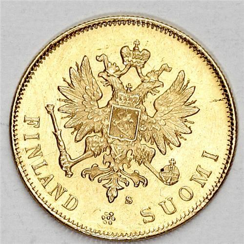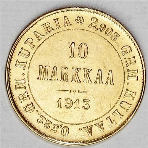 Nicholas II of Russia gold 10 Markkaa 1913, KM8.2, bril