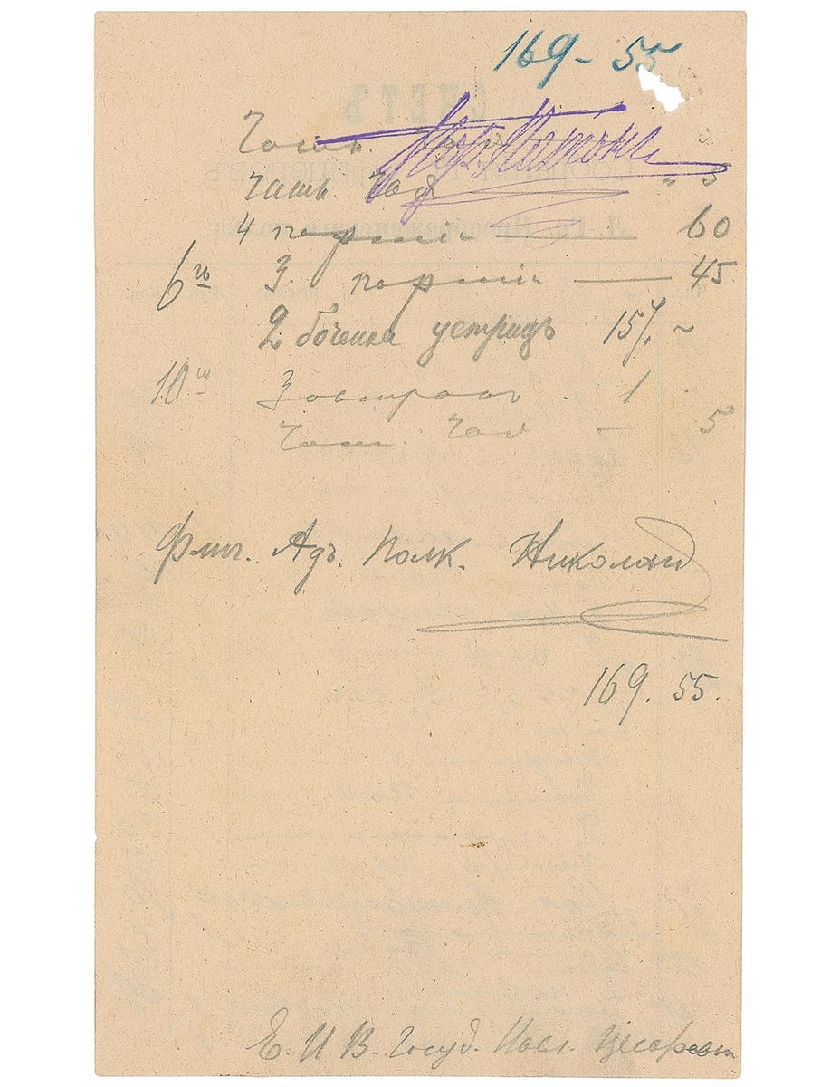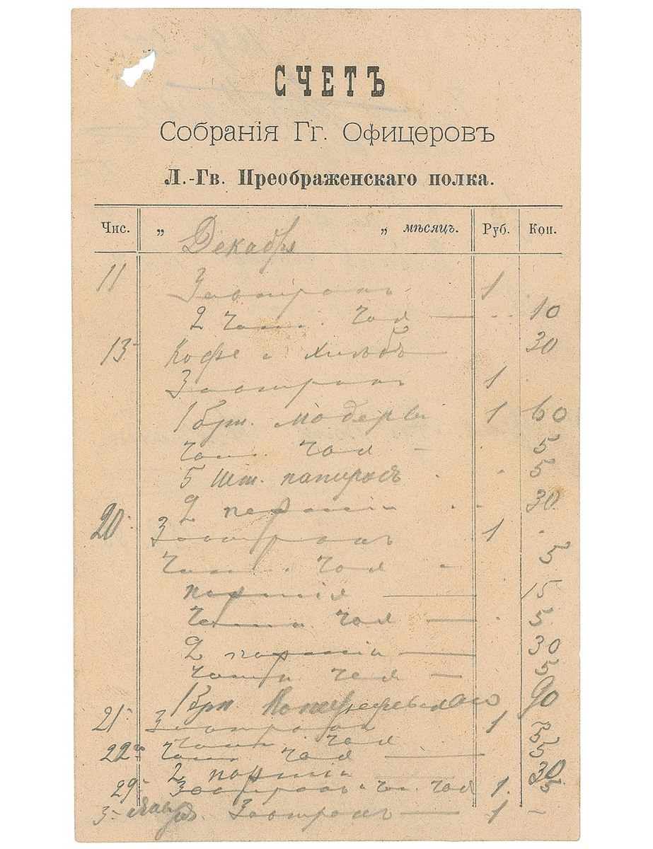 DS in Cyrillic, one page, 4.25 x 7, no date [but pre-1894]. A bill from the Preobrazhensky Regiment Officer’s Club, signed in Cyrillic in pencil. In fine condition, with an area of paper loss to the upper left corner.