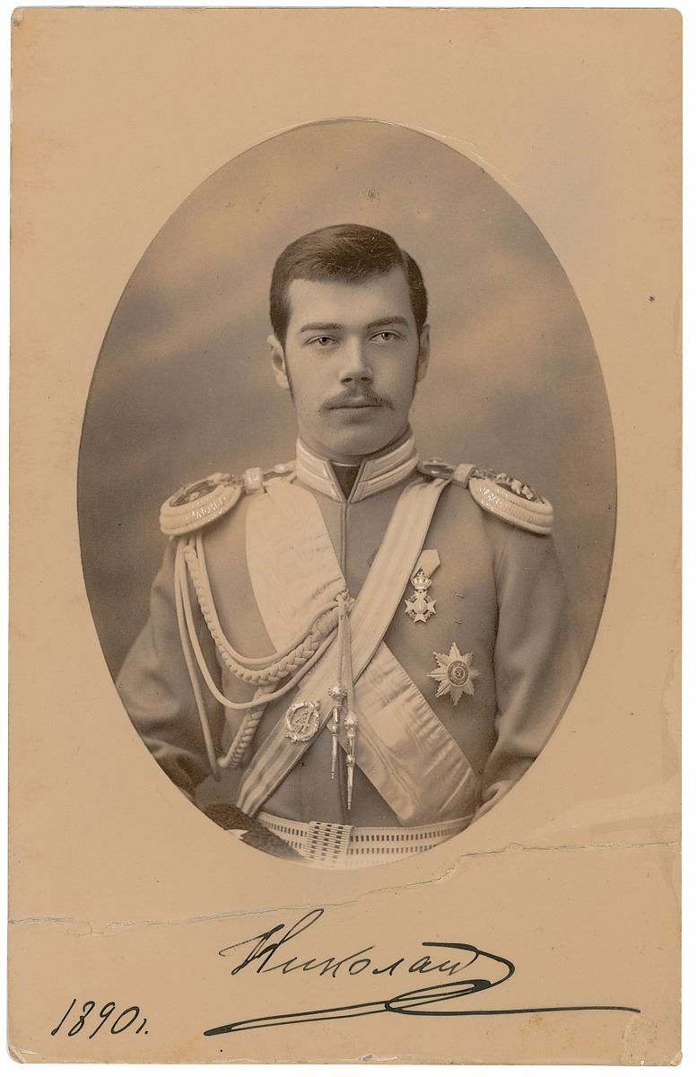 Handsome 4 x 6.5 cabinet photo featuring a sharp bust-length portrait of Nicholas II in his decorated uniform, signed at the bottom in black ink in Cyrillic, “Nicholas, 1890.” In very good condition, with a professionally reinforced heavy crease to the bottom touching the top of the signature, some cracking to finish along the crease, and trimmed edges.