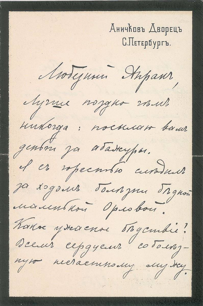 The last Tsar of Russia (born 1868) who reigned from 1894 until he was deposed in 1917. In the wake of the Russian Revolution, Nicholas, Empress Alexandra, and their children were imprisoned and finally executed on July 17, 1918. ALS in Cyrillic, one page both sides, 4 x 6, black-bordered Anichkov Palace letterhead, January 30, 1895. Letter to a member of the Orlov family, in full (translated): “It is better late than never: sending you the money for the lampshades. With deep sorry I’ve been following the illness of the poor little Orlov. What a horrible disaster! From all my heart expressing condolences to the unfortunate husband. I hope you will recover soon.” In fine condition. Nicholas II spent much of his childhood at Anichkov Palace, an imperial castle in Saint Petersburg, and the family celebrated some of their happiest events and festivities there. Just two months before this letter, Alexander III passed away, making 26-year-old Nicholas the newly consecrated Tsar of Russia. Despite being under-prepared and mostly unskilled, Nicholas quickly became an extension of his father’s conservative policies, concentrating his attention on the smaller details of administration and his role as head of Russia’s Eastern Orthodox Church. A sought-after early letter from the start of his reign.