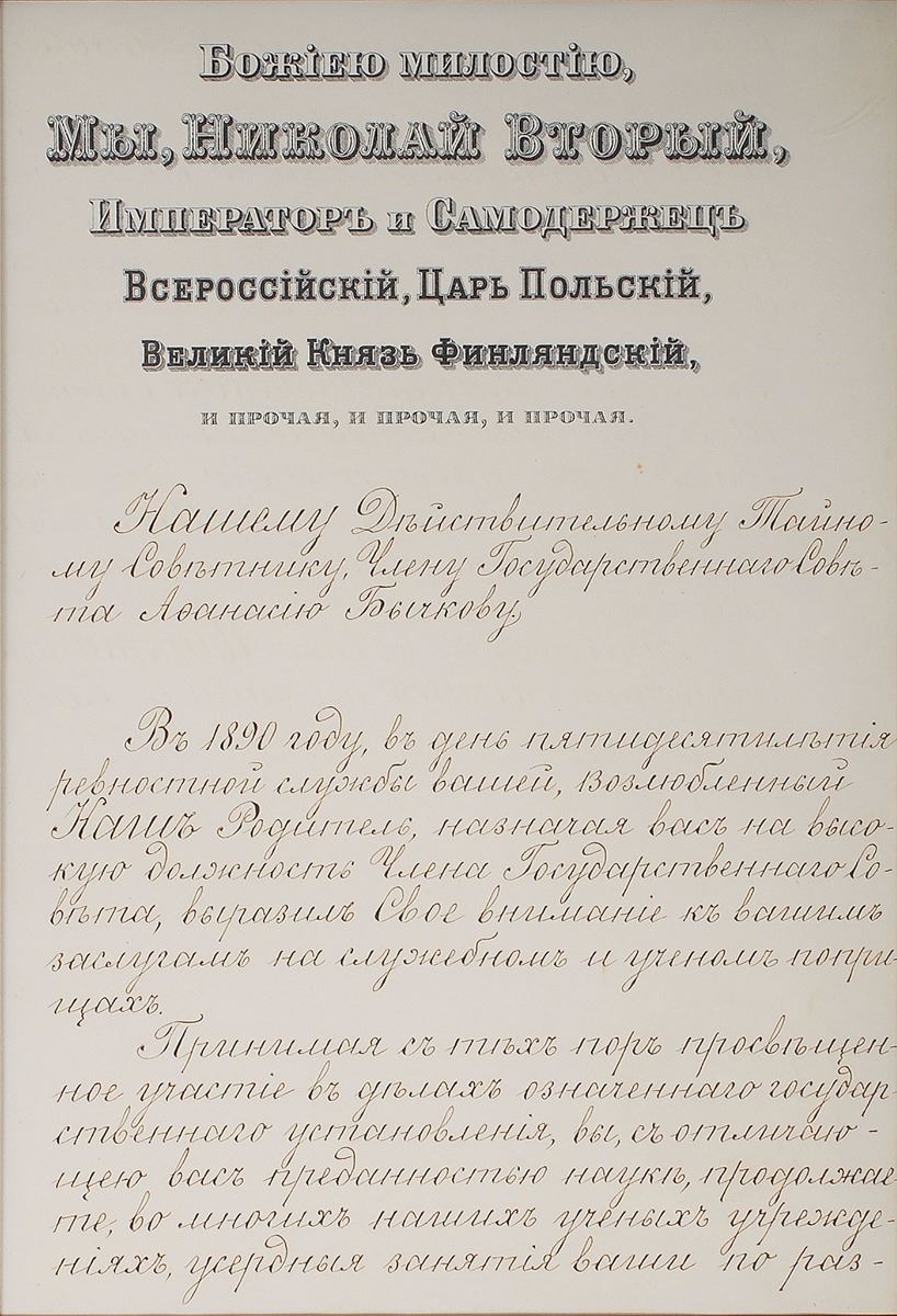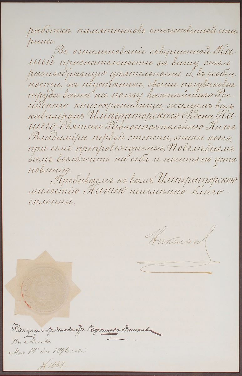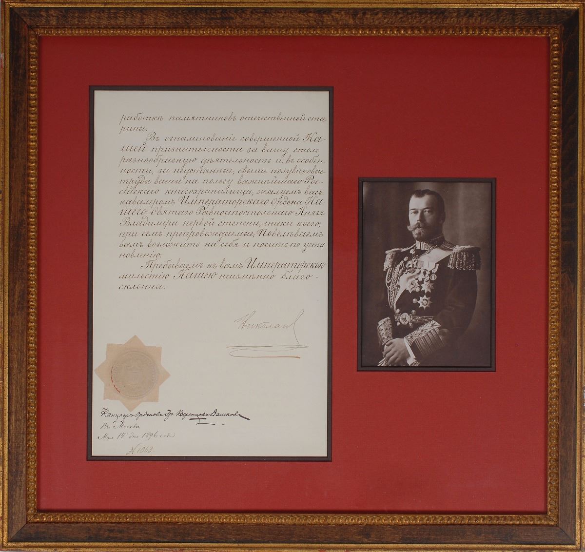 Choice manuscript DS in Cyrillic, signed “Nicholas,” one page both sides, 8.5 x 13, May 14, 1896. Untranslated document related to awarding a medal. The paper seal affixed to the lower left remains fully intact. Nicely double-matted and framed with a portrait of Nicholas to an overall size of 21 x 20, with a glass backing for viewing the opposite side. In fine condition.