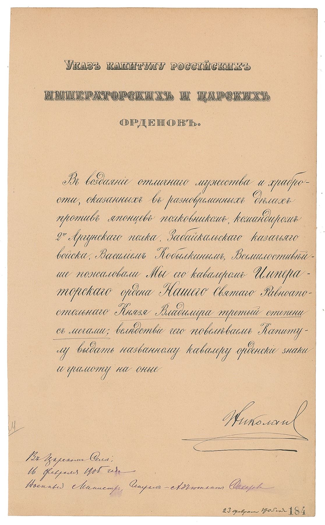 Partly-printed DS in Cyrillic, signed “Nicholas,” one page, 8.5 x 14, February 16, 1905. Decree addressed to the Chapter of the Russian Imperial and Royal Orders, presenting to Colonel Vasily Kobylkin, commander of the 2nd Argun Regiment, Zabaikal Cossack, the Imperial Order of 3rd decree with swords, in recognition of his exceptional bravery and courage during the war with Japan. Signed at the conclusion by Nicholas II, and countersigned by the Minister of War, Adjutant General Sakharov. In fine to very fine condition, with trimming to the left edge. Accompanied by a letter of authenticity from Alacona.