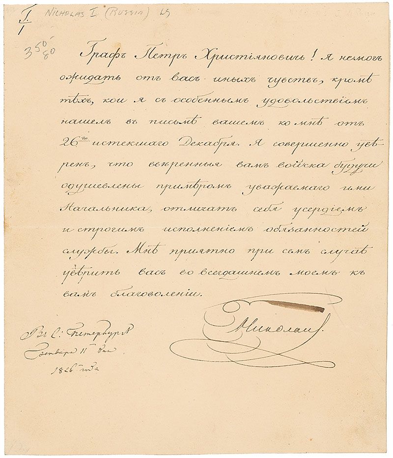Czar of Russia (born 1796) who reigned from 1825 until his death in 1855. By crushing the Decembrist Uprising, he confirmed the autocracy of czarist rule, but disastrous losses in the Crimean War marked the collapse of his foreign and domestic policies. LS in Russian, signed “Nikolai I,” one page, 7.5 x 8.75, January 11, 1826. Letter to Count Peter Khristianovich. In part (translated): “I could not have expected feelings from you other than those which I found, with particular pleasure, in your letter to me…I am thoroughly convinced that the troops you have raised will be inspired by the example of the leader who is respected by them, to distinguish themselves zealously and strictly performing their required duties.” In fine condition, with a couple of small pencil notations to top left.