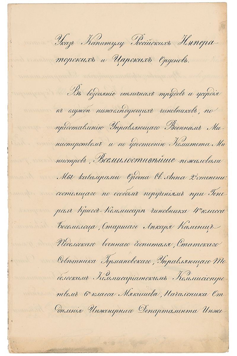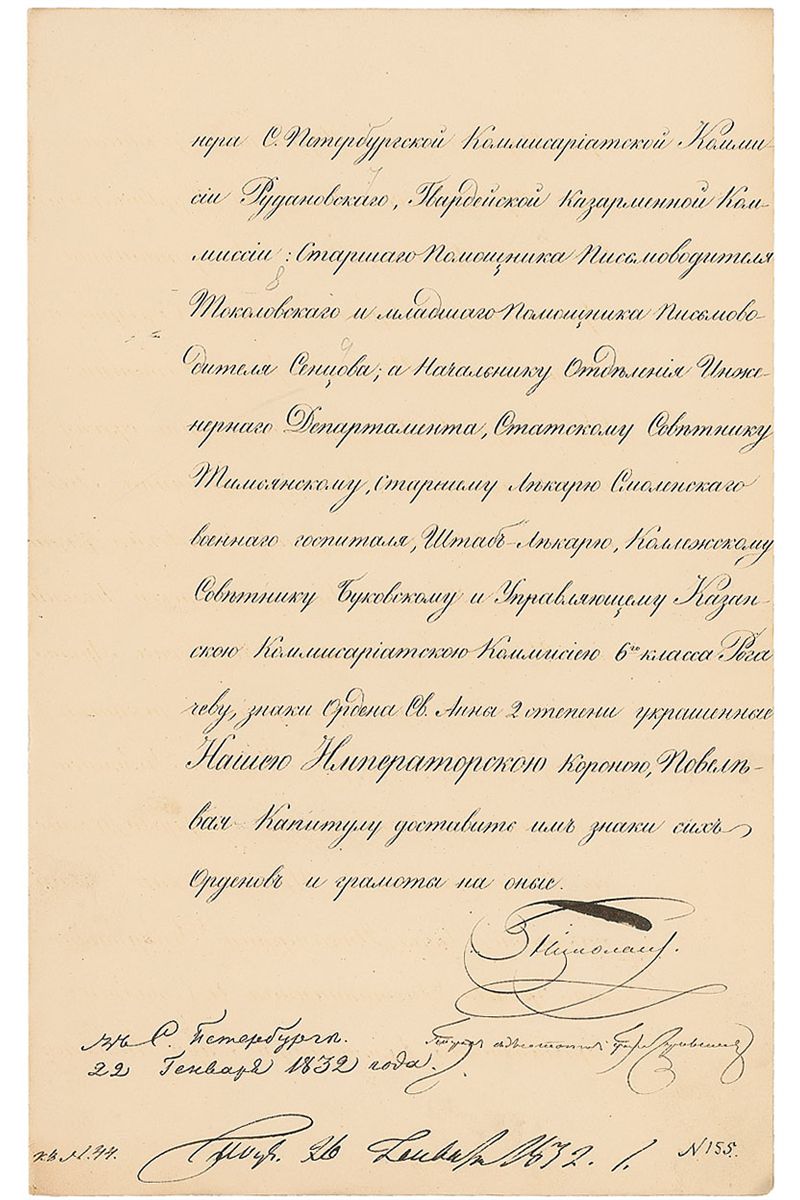Czar of Russia (born 1796) who reigned from 1825 until his death in 1855. By crushing the Decembrist Uprising, he confirmed the autocracy of czarist rule, but disastrous losses in the Crimean War marked the collapse of his foreign and domestic policies. Manuscript DS in Russian, signed “Nikolai,” three pages on two adjoining sheets, 8.25 x 13, January 22, 1832. Nicholas bestows medals to several prominent men and soldiers. In part (translated): “In reward for zealous duties and diligence in service of the following officials, as recommended by the Ministry of War through the suggestion by the Cabinet of Ministers, We most graciously have bestowed upon the following men, the title of cavalier of the Imperial order of our Saint Anna.” Signed at the conclusion by the Czar and countersigned by another official. In fine condition, with a partial separation to hinge, and a bit of mild toning.
