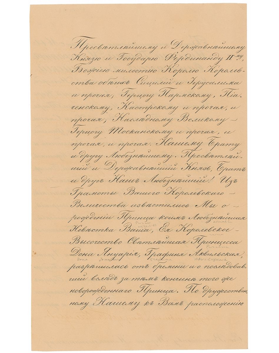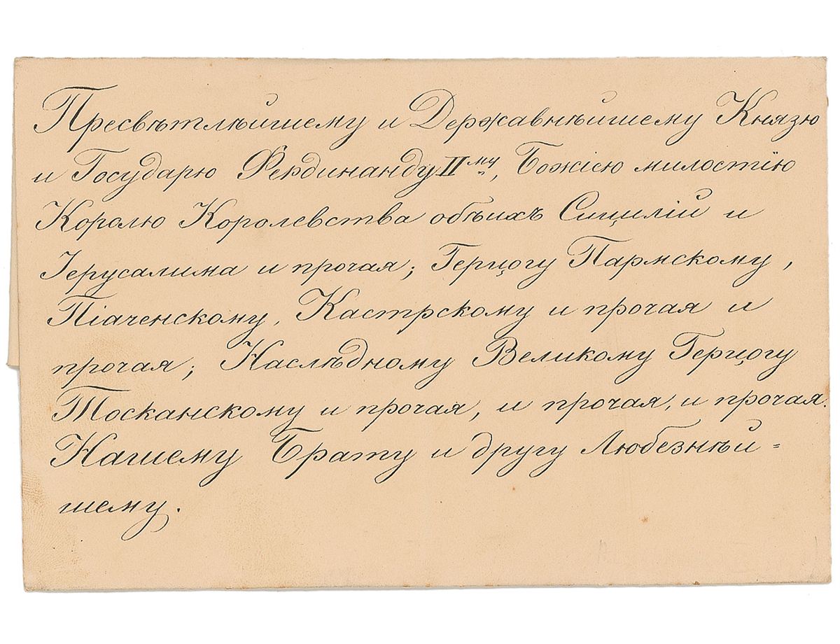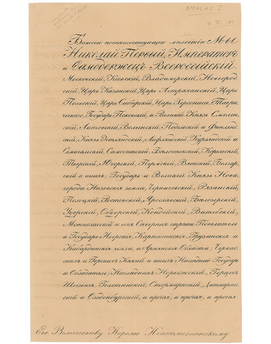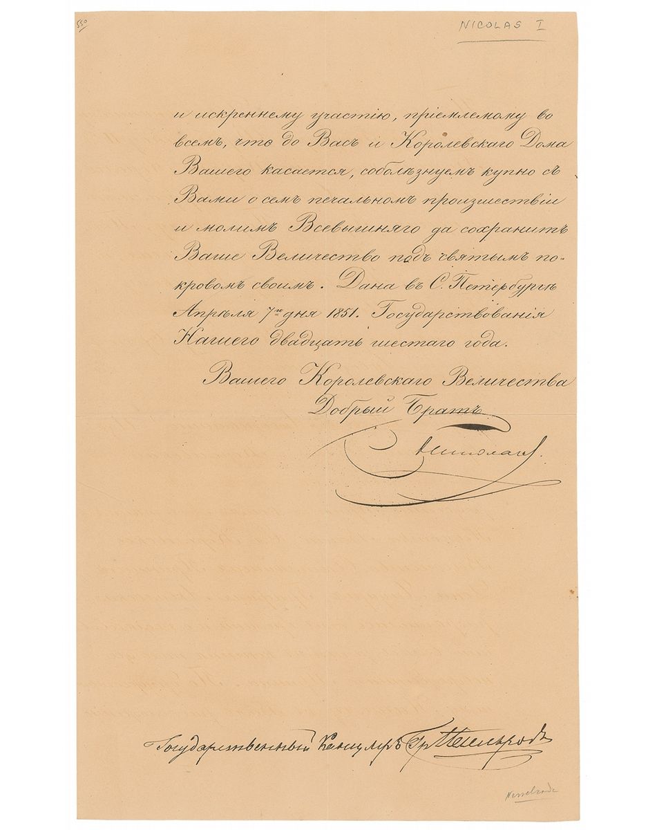 Czar of Russia (born 1796) who reigned from 1825 until his death in 1855. By crushing the Decembrist Uprising, he confirmed the autocracy of czarist rule, but disastrous losses in the Crimean War marked the collapse of his foreign and domestic policies. Scarce LS in Russian, three pages on two adjoining sheets, 8.5 x 13.75, April 7, 1851. Untranslated letter to a European king on the birth of a prince. Signed at the conclusion in Cyrillic by Nicholas and countersigned by the minister of foreign affairs, Karl Nesselrode. In fine condition, with central vertical and horizontal folds with small edge separations. Accompanied by a transmittal envelope bearing a large embossed paper seal. This dates to a particularly chaotic time in the Russian kingdom—a series of revolutions and political upheavals occurred throughout Europe in 1848, which Nicholas helped to suppress. At this same time, he was adopting an aggressive stance toward the Ottoman Empire, and war broke out between the two world powers in 1853, ultimately leading to the Crimean War which pitted Russia against the whole of Europe.