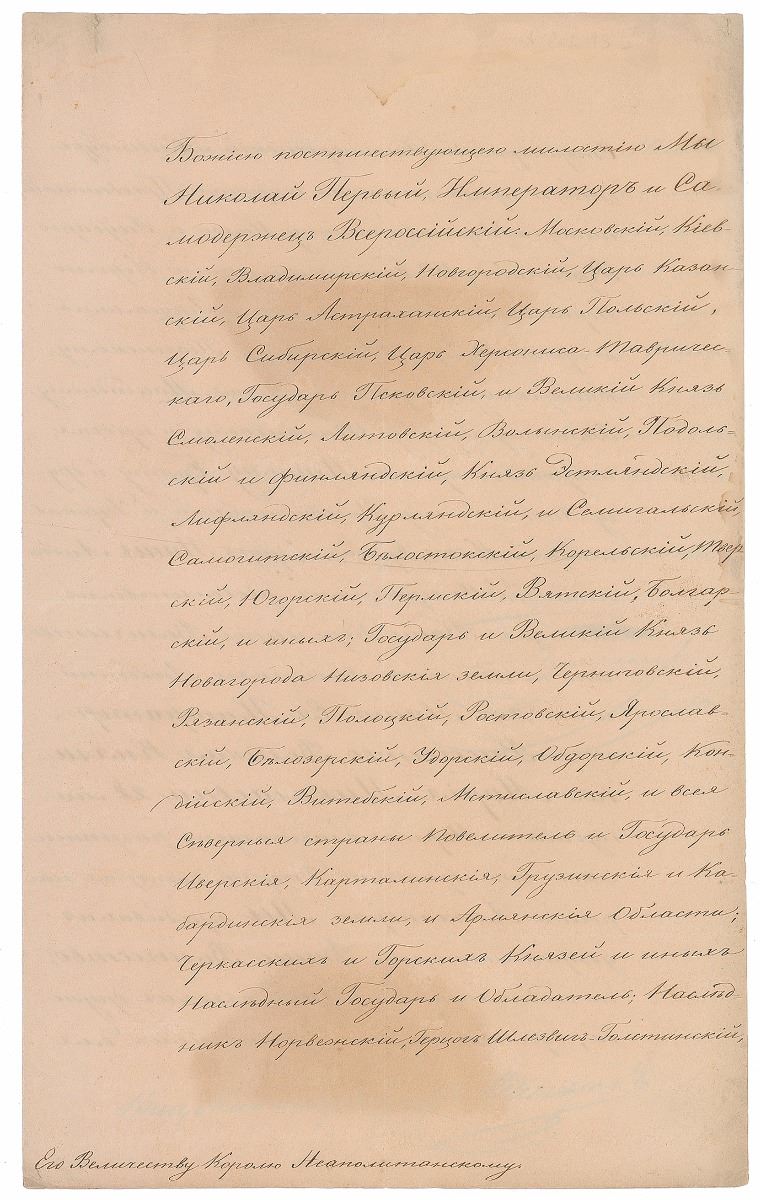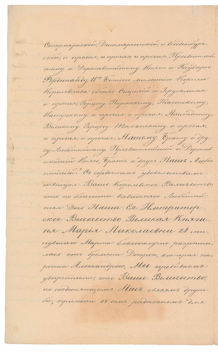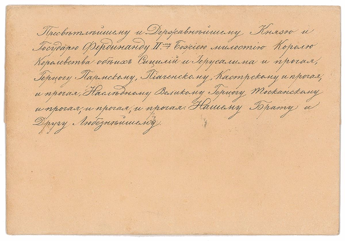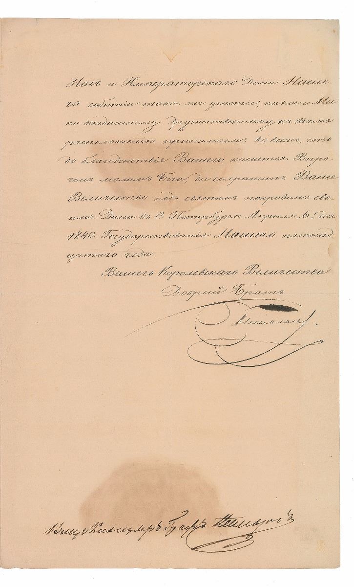 LS in Cyrillic, signed “Nicholas,” three pages on two adjoining sheets, 8.75 x 14, April 6, 1840. Important letter to King Ferdinand II of the Two Sicilies announcing the birth of his granddaughter, Princess Alexandra Romanovskaja. In part (translated): "With heartfelt pleasure We are announcing that by the Goodness of the Almighty Our Dearest Daughter, Her Imperial Highness Grand Duchess Maria Nikolaevna on March 28 successfully gave birth to the Daughter who was named Alexandra. We are confident that Your Majesty due bonds of friendship joining Us, will take part in the joyful event for Us and the Imperial House.” Boldly signed at the conclusion by Nicholas I and countersigned by Minister of Foreign Affairs Karl Nesselrode. Partial separations to adjoining fold, light soiling, a few tiny repaired edge tears, and areas of toning due to large envelope seal, otherwise fine condition. Accompanied by the original transmittal envelope which retains portions of the large red wax seal. Sadly, Princess Alexandra Romanovskaja passed away in childhood at the age of three.