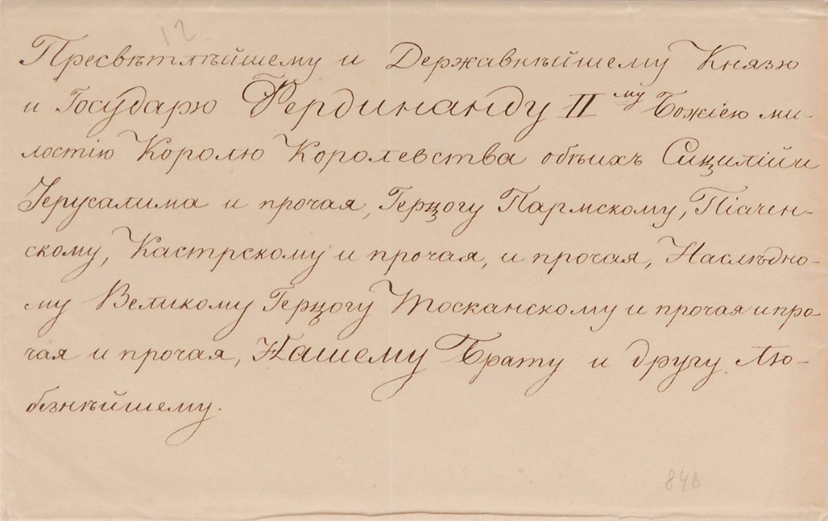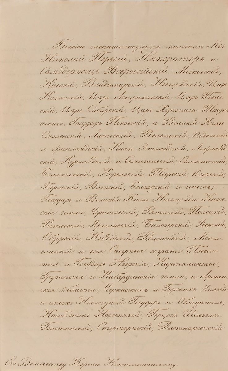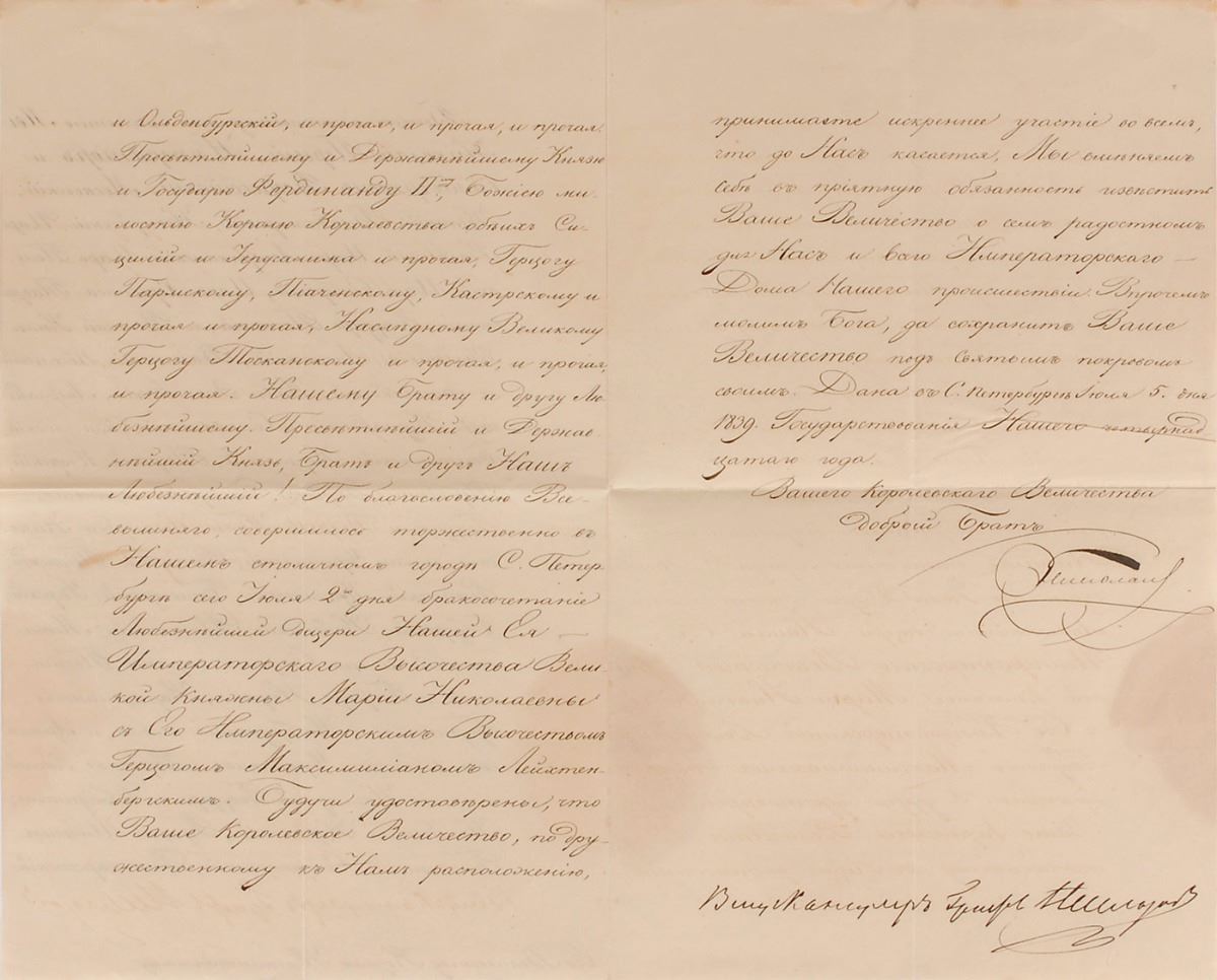 Untranslated LS in Cyrillic, three pages on two adjoining sheets, 8.75 x 14, 1839. In fine condition, with circular seal-related areas of toning. Accompanied by the original transmittal cover.