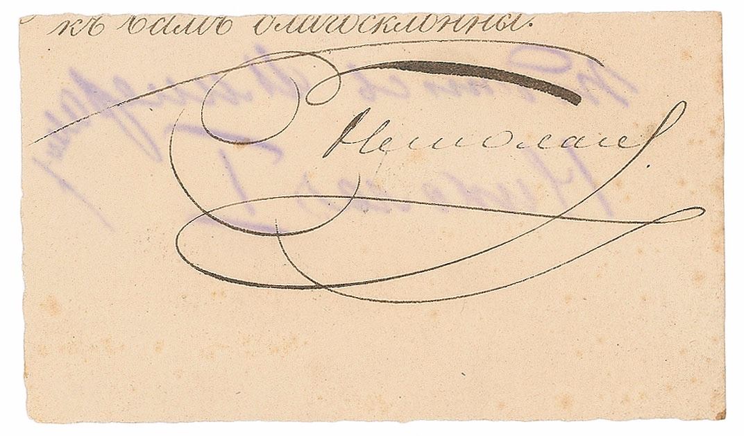 Czar of Russia (born 1796) who reigned from 1825 until his death in 1855. By crushing the Decembrist Uprising, he confirmed the autocracy of czarist rule, but disastrous losses in the Crimean War marked the collapse of his foreign and domestic policies. Circa 1825 ink signature in Cyrillic on an off-white 4.25 x 2.5 slip. In fine condition, with pencil notations on the reverse showing through.