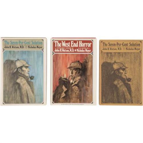 <B>Nicholas Meyer. Two Sherlock Holmes First Editions and One Advance Copy</B></I>, including: <B><I>The Seven-Per-Cent Solution</B></I></B></I>. New York: E. P. Dutton and Company, 1974. Advance copy. Octavo. 253 pages. Paper binding. Overall near fine with minor soiling. [and:] <B><I>The Seven-Per-Cent Solution</B></I></B></I>. New York: E. P. Dutton and Company, 1974. First edition. Octavo. 253 pages. Green cloth spine over green paper boards. Gilt spine titles. Overall fine with minor wear. Dust jacket is fine. [and:] <B><I>The West End Horror</B></I></B></I>. New York: E. P. Dutton and Company, 1976. First edition. Octavo. 222 pages. Red cloth and gilt spine titles. Overall, book and dust jacket are fine. This advance and first edition lot of Meyer's first two Holmes novels is an absolute must for the Sherlockian collector. <I>From the Robert and Diane Yaspan Collection.</B></I><BR><BR><b>Shipping:</b> Books & Catalogs (<a target="_blank" href="http://www.heritageauctions.com/common/shipping.php">view shipping information</a>)