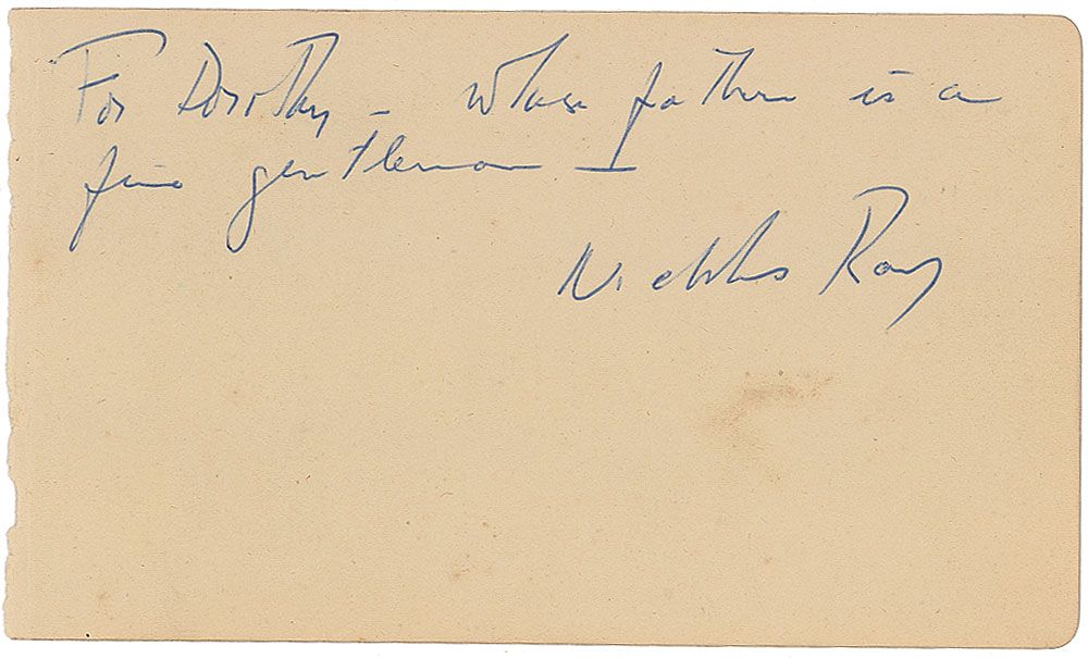Influential director of such classic films as Rebel Without a Cause, Johnny Guitar, and King of Kings. His distinctive style was one of the prime motivating factors in the development of the “auteur” theory of filmmaking. Ballpoint signature and inscription, “For Dorothy—whose father is a fine gentleman—Nicholas Ray,” on an off-white 6.25 x 3.5 album page. In fine condition, with a bit of scattered light soiling.